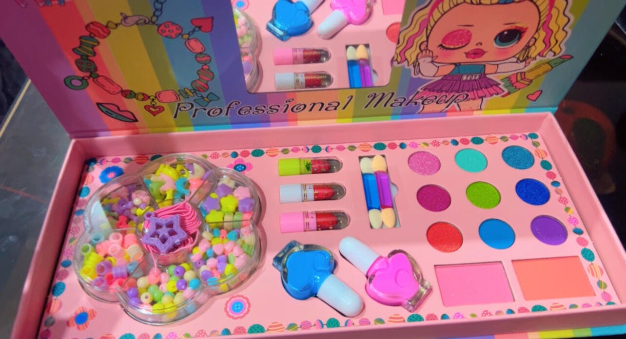 - 💄 Child-safe makeup items including lip gloss, eyeshadow, blush, and glitter.