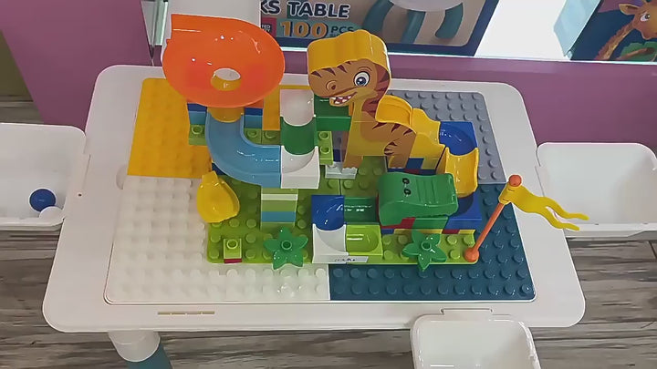 Fuel creativity and learning with this 6-in-1 Kids Building Blocks Activity Table Set. Designed for endless fun and skill-building, this set includes a durable table, matching chair, 104 colorful building blocks, and storage compartments to keep everything organized. Whether it's for building, drawing, learning, or even snack time, this versatile table transforms playtime into a productive and imaginative experience.